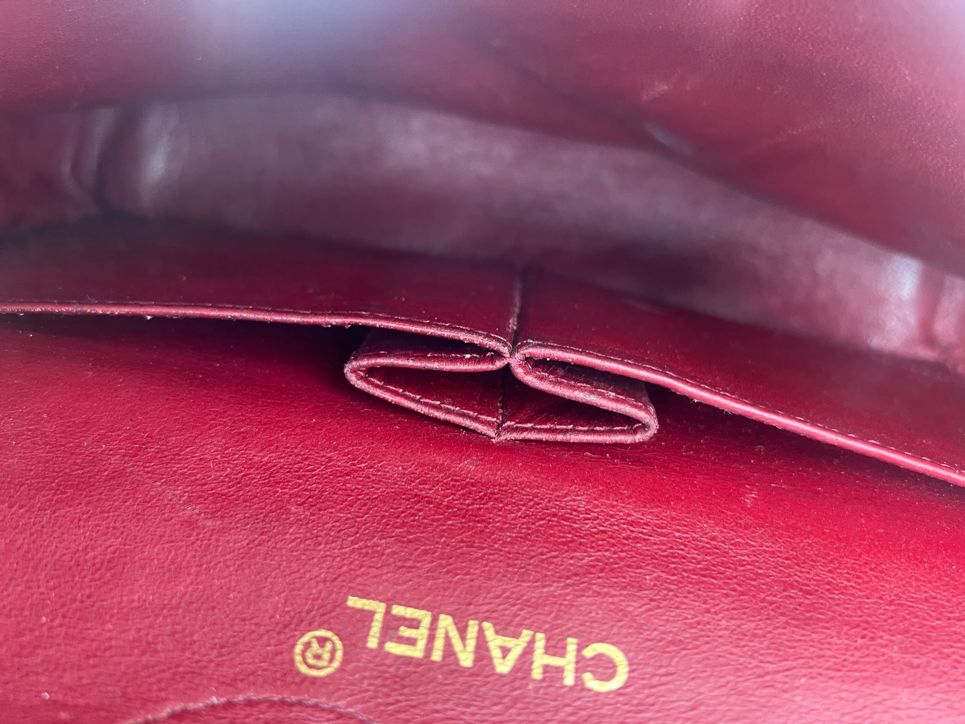 • Innenleben: Das berühmte bordeauxrote Lederfutter mit mehreren Steckfächern und der charakteristischen „Double Flap“ (Doppelklappe).