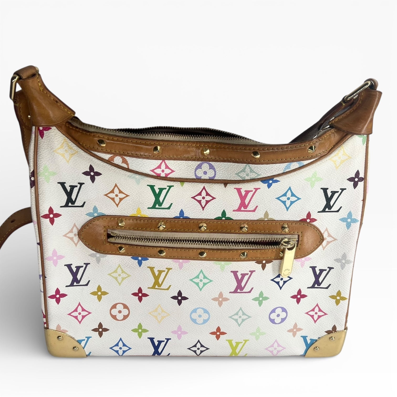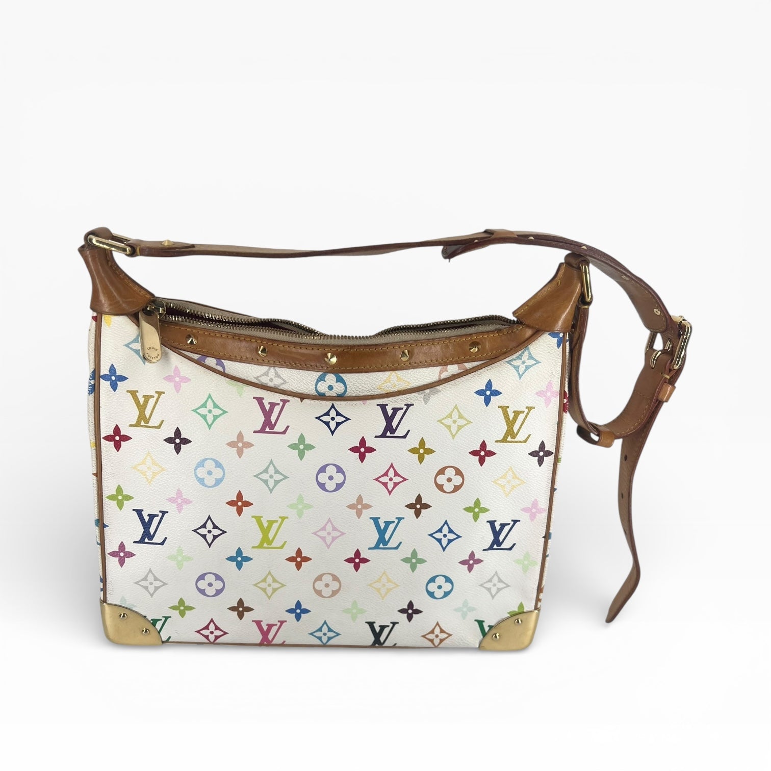 Die Louis Vuitton Boulogne aus der limitierten Zusammenarbeit mit dem japanischen Künstler Takashi Murakami ist ein absolutes Sammlerstück und ein Symbol für die Pop-Kultur der frühen 2000er Jahre. Das lebendige Multicolor-Monogram auf weißem Hintergrund verleiht der klassischen Silhouette eine verspielte und dennoch luxuriöse Note. Mit ihren markanten goldfarbenen Nietenbesätzen und der verstärkten Eckenstruktur ist diese Tasche ein echtes Statement-Piece.